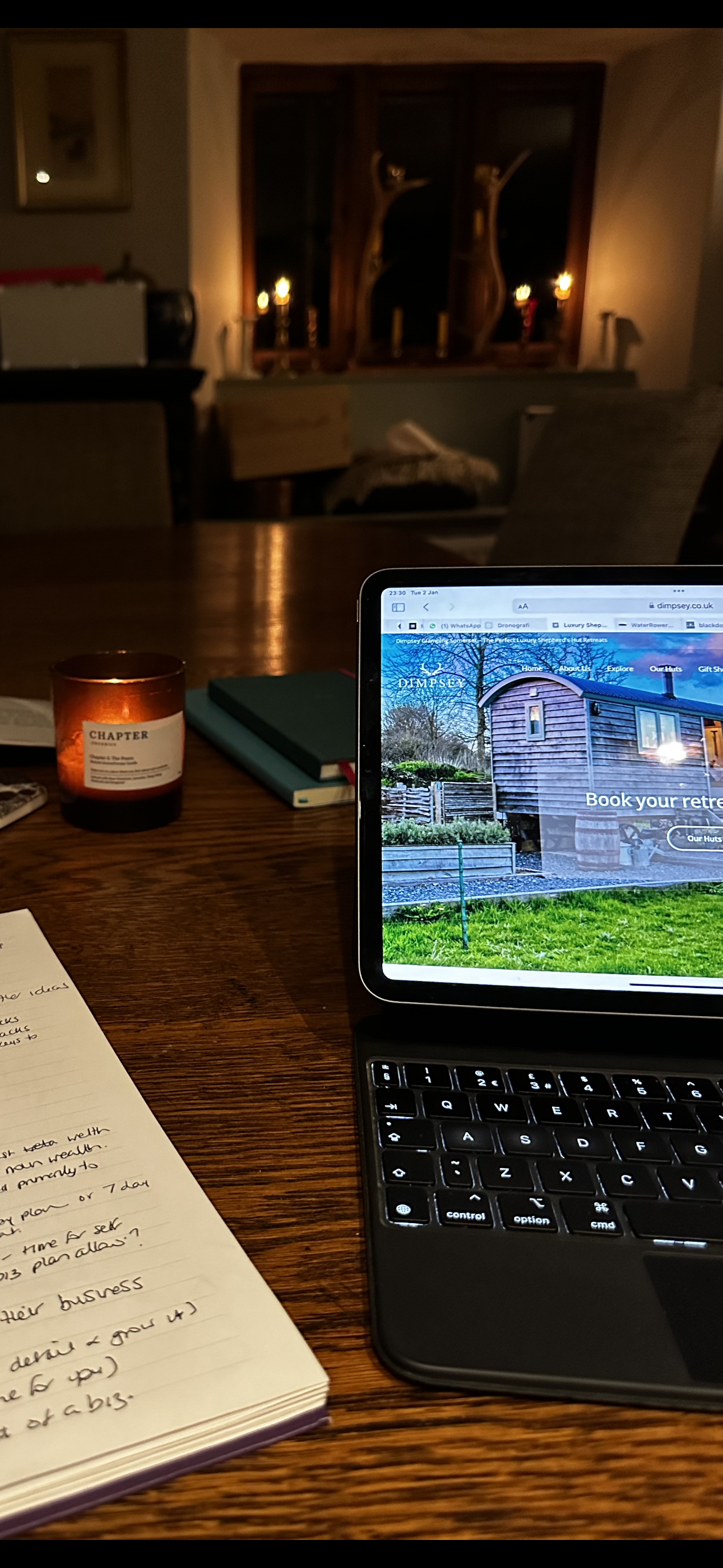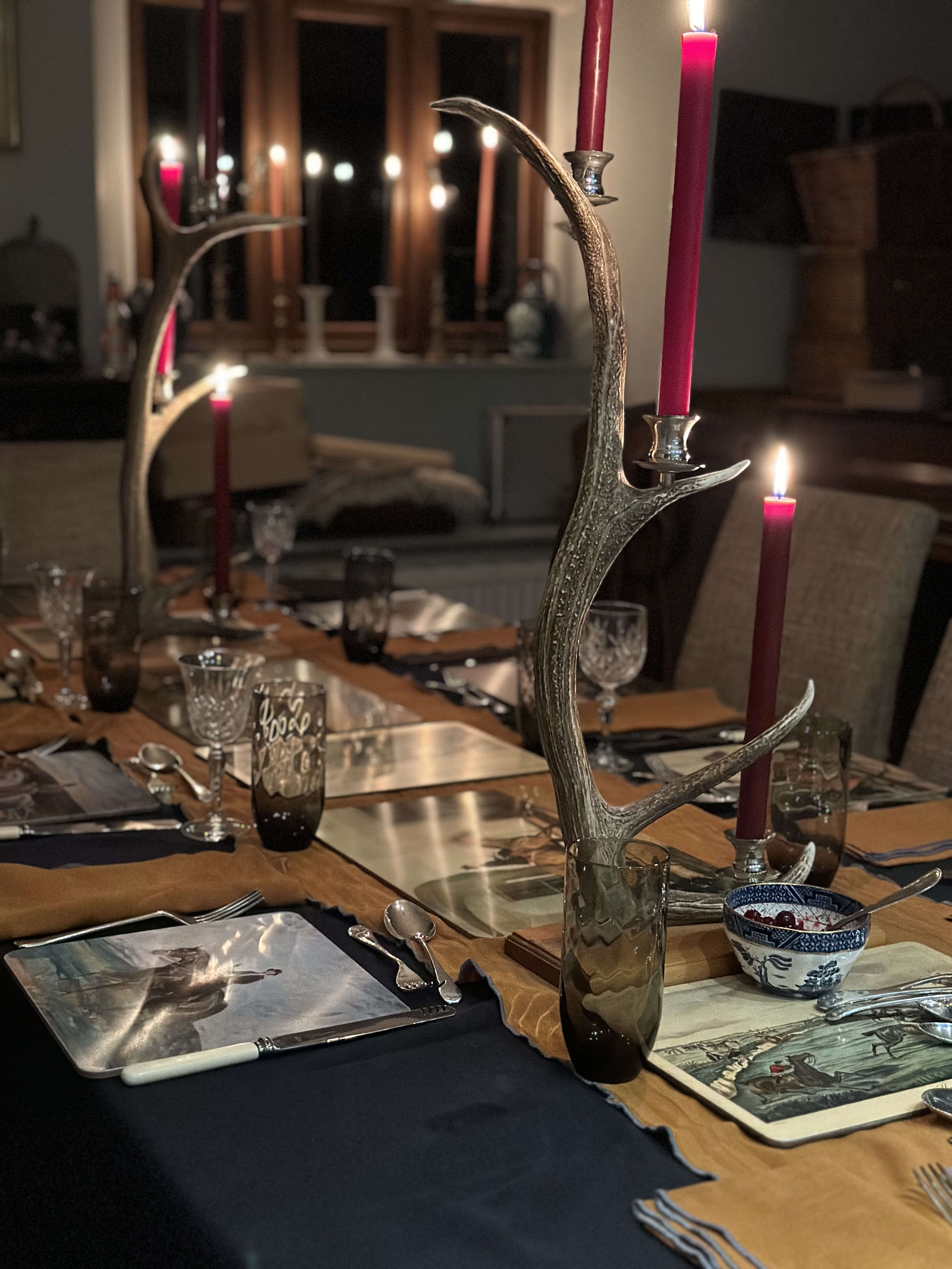 Apart from high days and holidays, we eat in the kitchen side, but winter finds me gravitating to the table in the other side to work, especially when I’m writing. Snoozing dogs keep their watch by the woodburner and the kettle is in easy reach. I often light a candle to work by – enjoying the dropping shadows as the light disappears towards the end of the day.